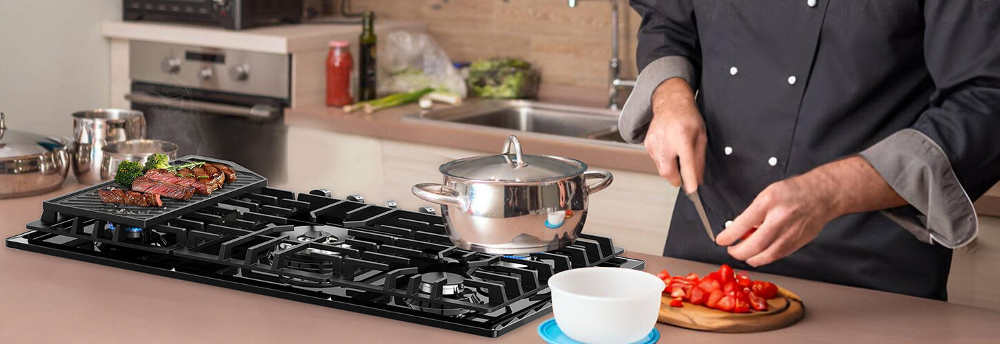 Efficient Performance - Our 36-inch gas cooktop offers include 1 auxiliary (4,000 BTU), 2 semi-rapid (7,000 BTU), 1 rapid (10,300 BTU), and 1 wok burner (13,000 BTU), High output of 41,300 BTU total, the fire burns quickly with a superpower and the flame with even heat distribution.