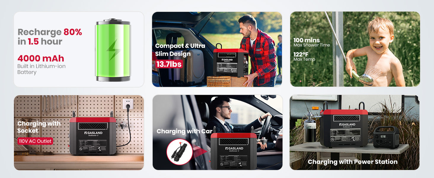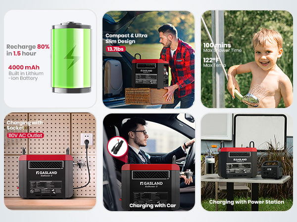 - Instant Hot Water Anywhere – comes with a built-in 4000 mAh rechargeable battery, fully charges in 1.5hr. With a heat capacity of 20,000 BTU, no standby, provides on-demand hot water for showering, washing dishes, or cleaning.